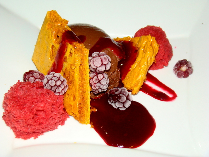 - La cantidad de bicarbonato debe ser precisa y determinada de ante mano, si deseamos burbujas grandes como el caramelo de la portada debemos pesar 10 grs, pero si queremos un caramelo con burbujas pequeñas y más unifomes como se ve en la foto del postre que muestro más abajo se deben pesar 8 grs. No debemos excedernos en bicarbonato pues afectará el sabor del caramelo.